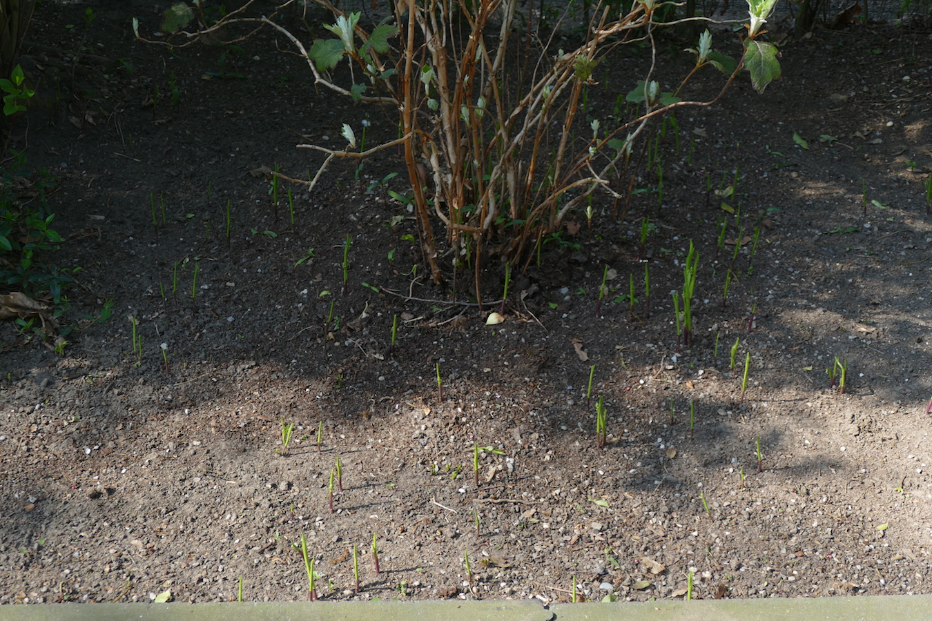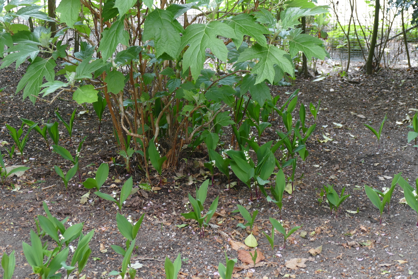 [Diavoorstelling tonen] De meiklokjes staan op verschillende plaatsen in de tuin: de belangrijkste plaatsen zijn de schaduwtuin waar ze door de sneeuwklokjes heen groeien en in de border naast de parkeerplaats aan de voet van een grote hortensia. Terug naar overzicht van de planten die op het Lam Gods zijn afgebeeld. – OMG! Van Eyck was here